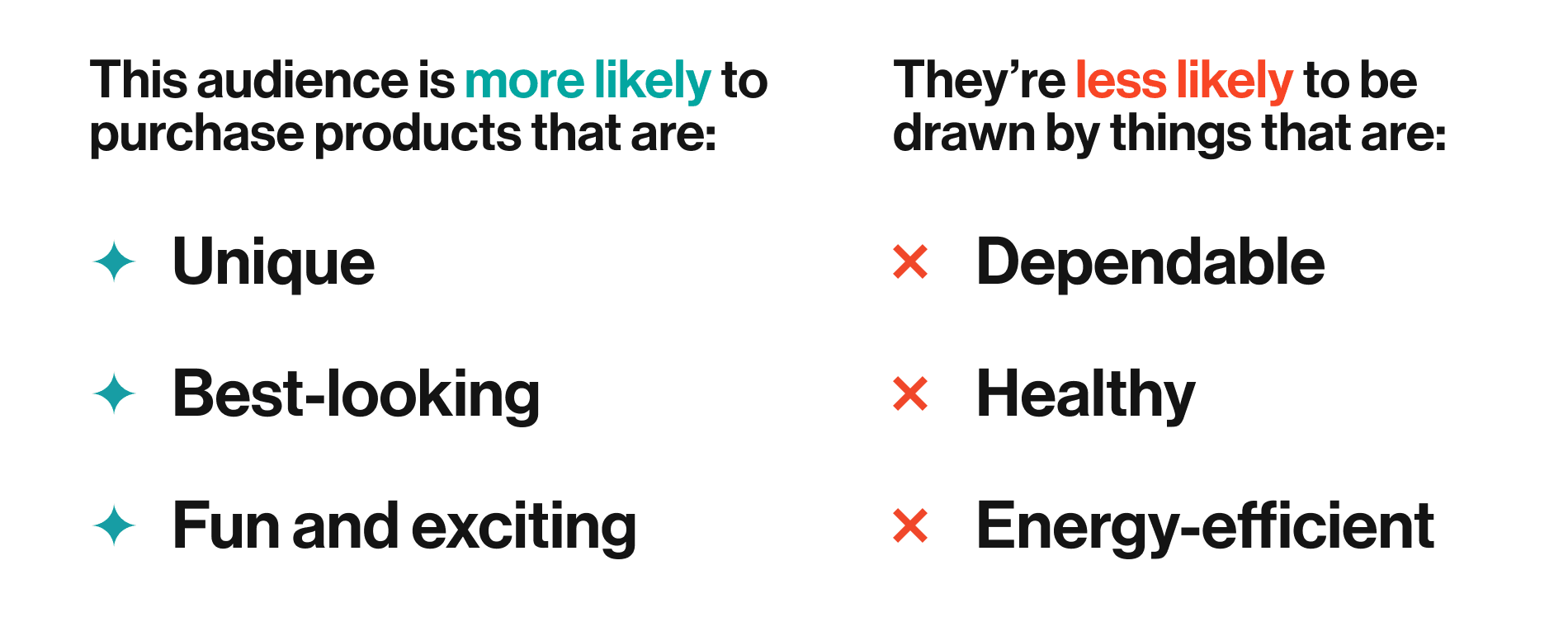 When you’re crafting your creative and messaging, consider using themes of being admired, successful, having adventures, being exciting, and prestige and power to better engage with this audience.