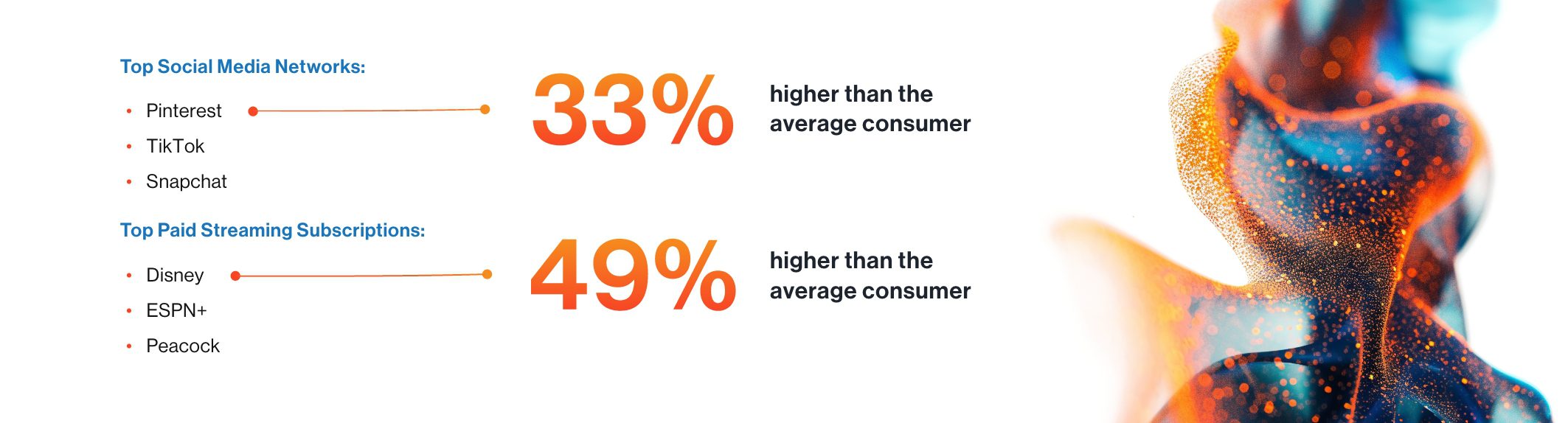 Understanding where to find these consumers and who’s engaging with your ads on social media and other platforms is crucial to optimizing your strategy once you have your back-to-school campaign up and running. When we looked at back-to-school shoppers, we found they are most heavily engaged on social media, specifically video websites like TikTok. Their rate of using Pinterest, TikTok, and Snapchat is 33% higher than the average consumer. Their top streaming networks are Disney+, ESPN+, and Peacock—and their rate of watching these networks is 49% higher than the actual consumer, indicating they’re extremely engaged here.