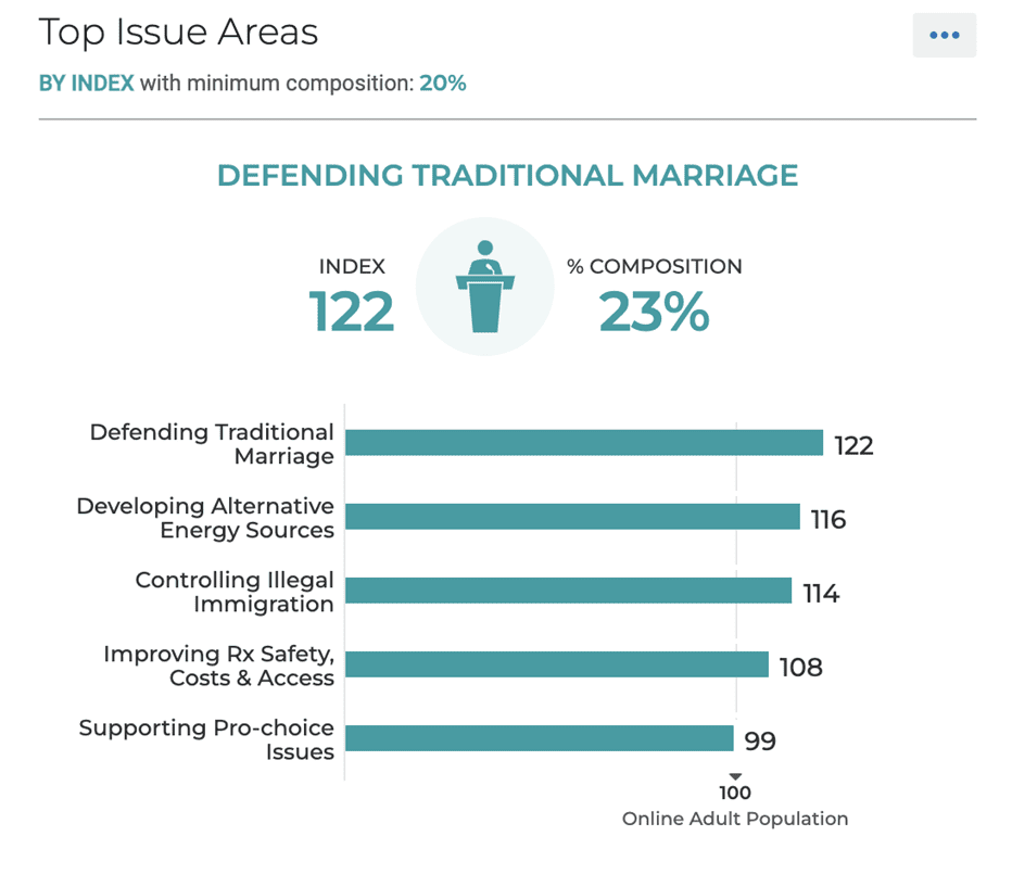 One major challenge rAI reveals for political operatives is the level of similarity between these groups of voters: They’re almost evenly split on number of males versus number of females. Their engagement level on social media is average, there are no significant differences in their income levels, similar percentages are 65 and older, and similar percentages have children under the age of 18.
