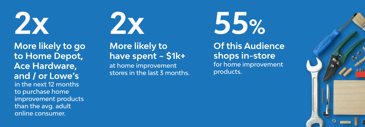 This audience has already started spending, and they’re prepared to make a big investment. Resonate data shows they’re twice as likely as the baseline American adult population to have spent over $1,000 at home improvement stores in the last three months. Over half of them are heading to the store to do some in-person shopping, and they’re twice as likely as the average adult online consumer to buy products from the Home Depot, Ace Hardware, and Lowe’s websites when they do shop online.