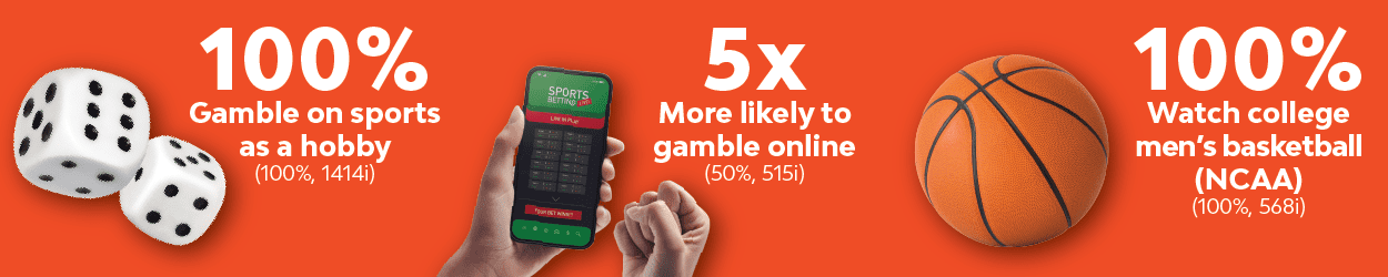 They love the game, and they love the thrill of a wager. This segment consists of individuals who consider themselves fans of NCAA Men’s Basketball, actively watch college basketball games, engage in online basketball discussions and enjoy gambling on sports. While not directly related to sports betting like the March Madness Resonate Segment, these individuals are still valuable targets for advertisers.