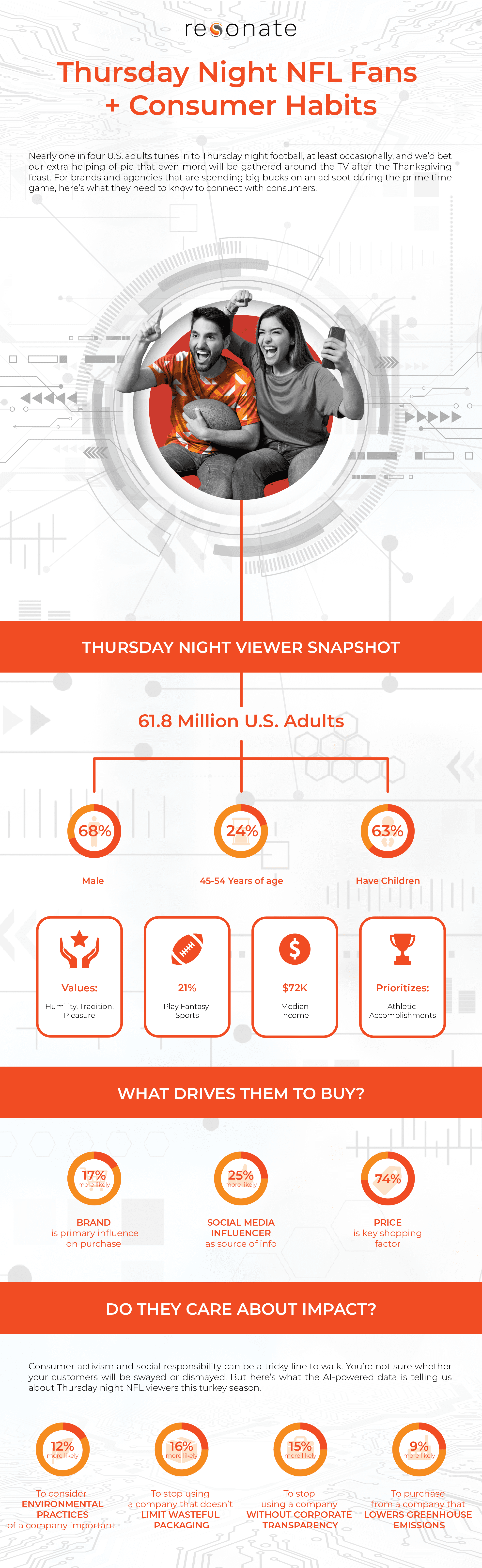 Using Resonate’s AI-powered data and analyzing within our data platform, built specifically for agencies and marketers, we looked at the avid and enthusiastic sports viewers who tune in to Thursday night football. Here’s what we learned about them, and what you should know if you’re trying to target this audience with marketing that will connect and convert. Spoiler: while some data seemed to track with expectations, like their penchant for fantasy sports, this group may care more about social impact than you would have assumed.