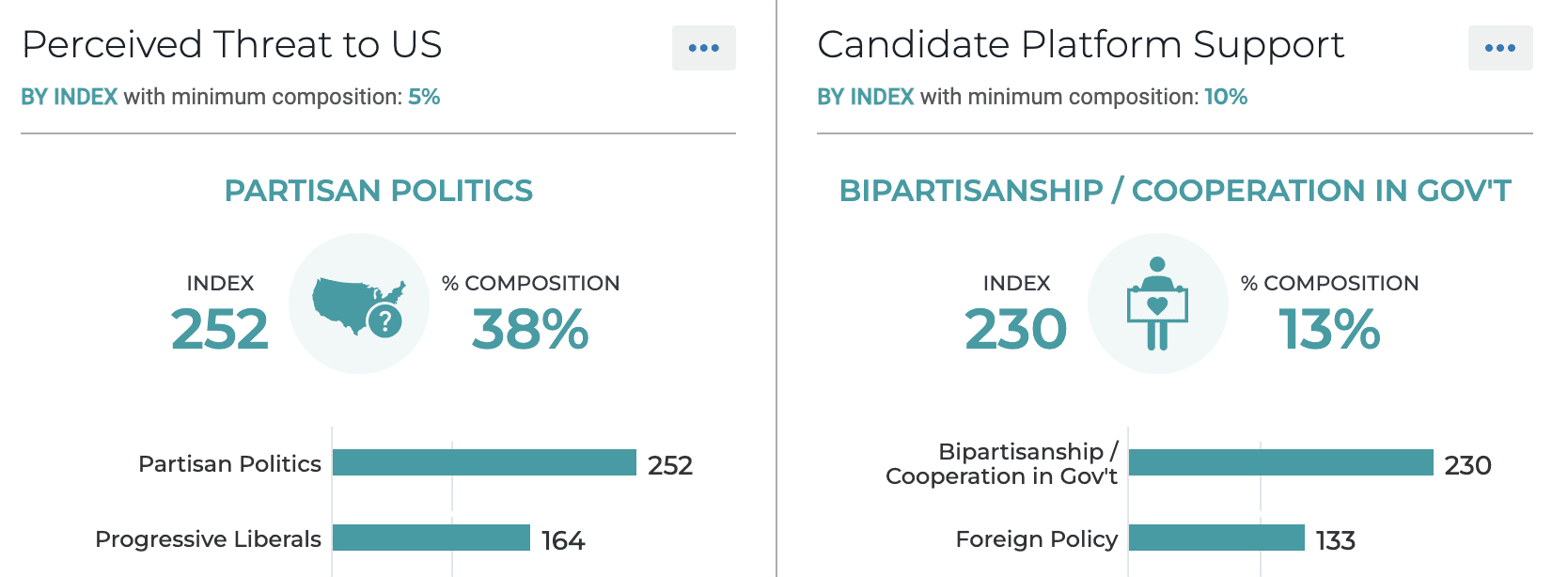 When comparing likely DeSantis voters against Trump voters, DeSantis supporters are 150% more likely to believe partisan politics are a major threat to the country. Moreover, they are 130% more likely to vote for candidates (up and down the ballot) who exercise bipartisanship.