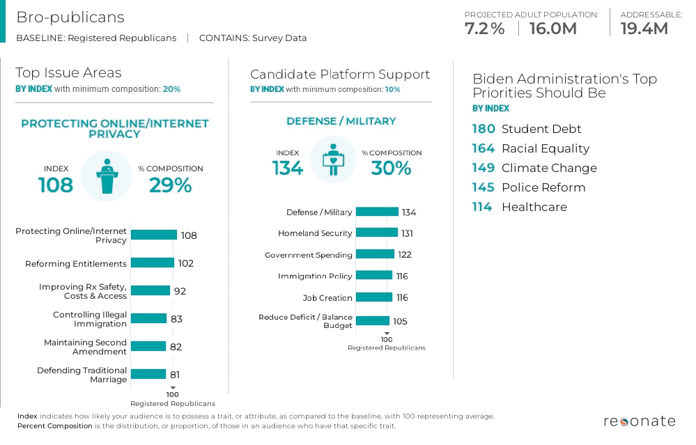 Here’s a deeper political analysis of Bro-publicans compared to the average registered Republican online. Notice that this audience is also much more likely to care about racial equality and climate change.