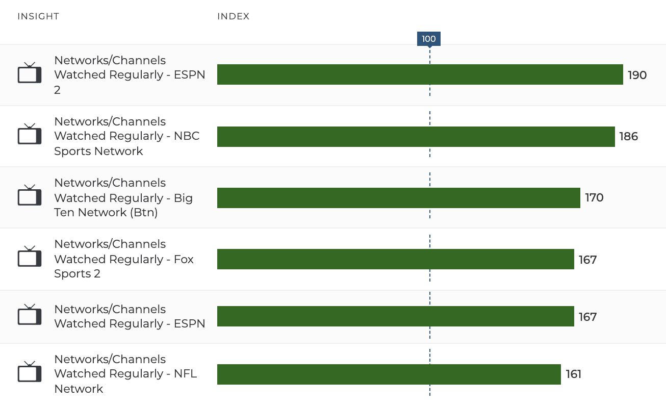 We looked at an audience of “Frequent Travelers” and noted that all of their top TV networks are sports channels. They’re 90% more likely than the average consumer to regularly watch ESPN 2 and 86% more likely to watch NBC Sports Network. As a sports network, this is an audience that is actively and frequently on your channel — your job now is to court travel advertisers who will see a strong ROAS by connecting the right message to the right audience on the channel.