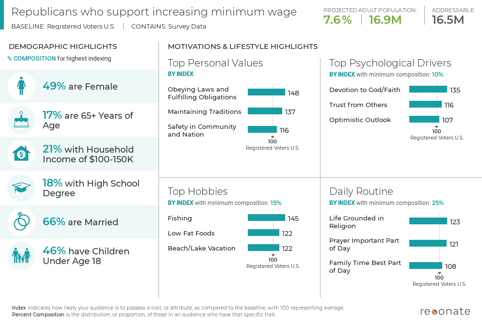 For example, Resonate models have identified an online audience of roughly 17M registered Republican voters who support increasing the federal minimum wage.