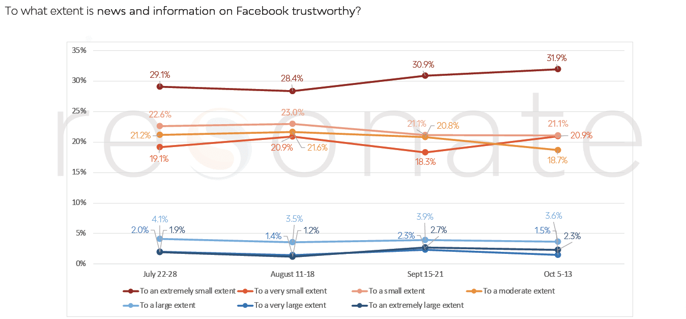 Close to 1 in 3 people only trust Facebook to an extremely small extent, growing steadily since the summer.