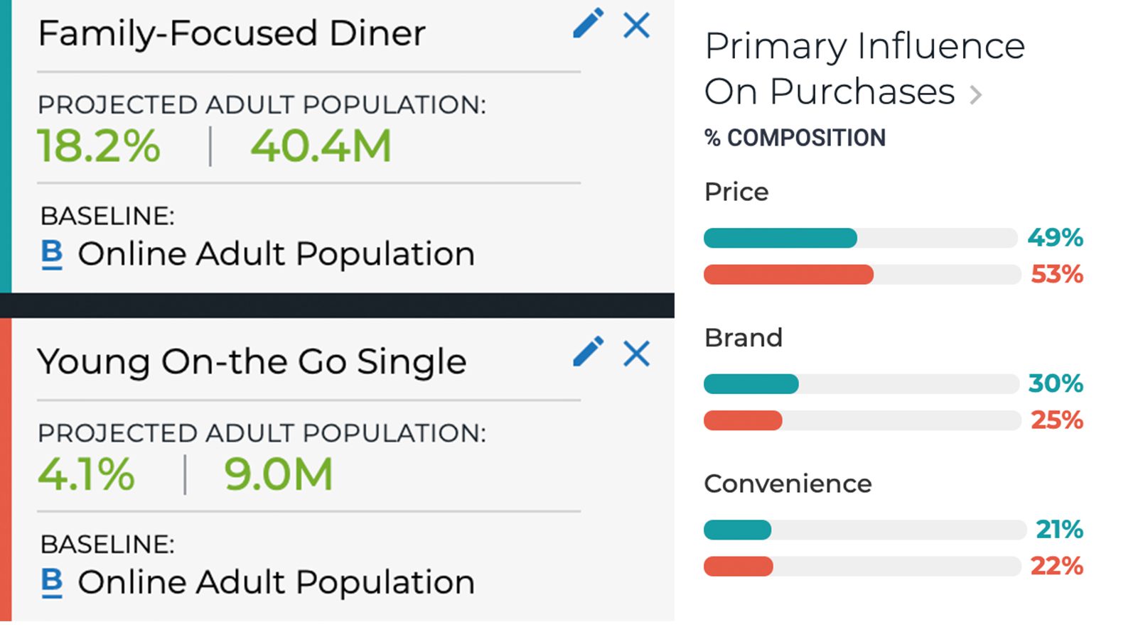 Below we have 2 dining segments. The first is the “Family-Focused Diner” who is married or in a civil union, has kids and enjoys family-friendly restaurants. The second segment is the Young On-the-Go Single. They are 18-34, single, no kids, and choose restaurants that are fun, exciting or popular.