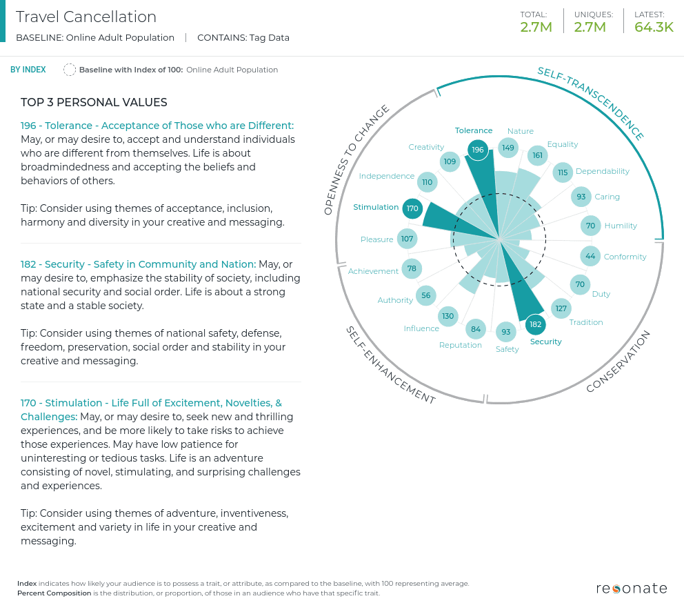 We dug into our Resonate data – which reveals thousands of attributes on over 200 million U.S. consumers and is updated in real-time, to learn more about the people that cancelling flights, hotel rooms and family vacations in order to help brands and companies like yours craft messaging in an unpredictable environment. We looked at their values, motivations and preferences, as well as how and where can you reach these people to send the right message about how your brand is maneuvering rapidly shifting information. We looked at the online consumers who have searched for content surrounding the Coronavirus, travel and refunds, cancellations, postponement, changes or rescheduling, and we uncovered some noteworthy insights to inform your business decisions during this time of uncertainty.