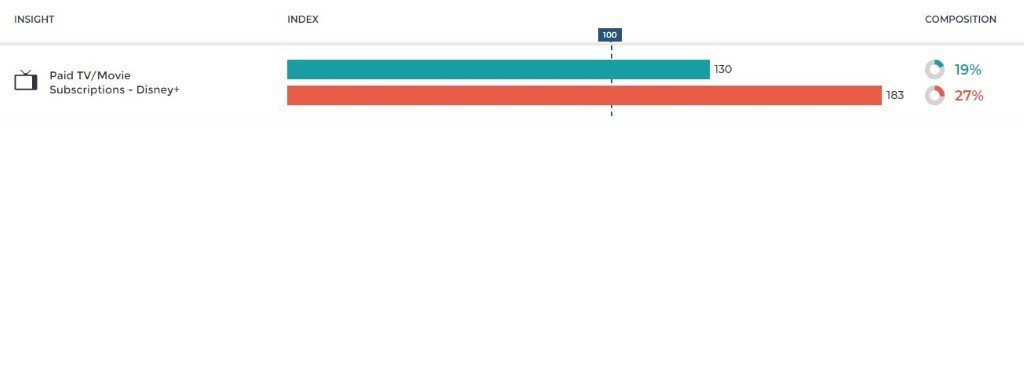 Below you can see who is more likely to stream Disney+ between millennials without kids (teal) and millennials with kids (orange).