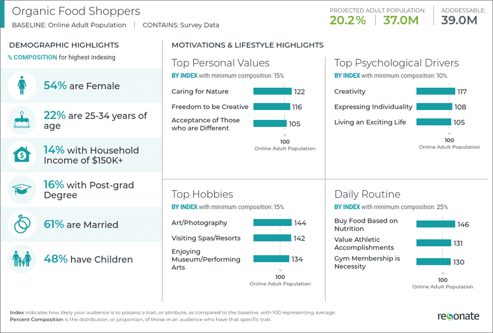 Let’s look at some of the insights in Resonate’s consumer insights platform for guidance on the ever-changing organic consumer. The Resonate Platform has insights on 37 million people who buy organic food.