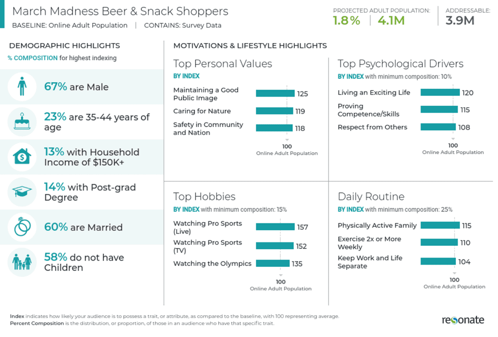 In less than a minute, I built an audience of consumers who regularly drink beer, watch college men’s basketball and purchase salty snacks in Resonate’s consumer intelligence platform.