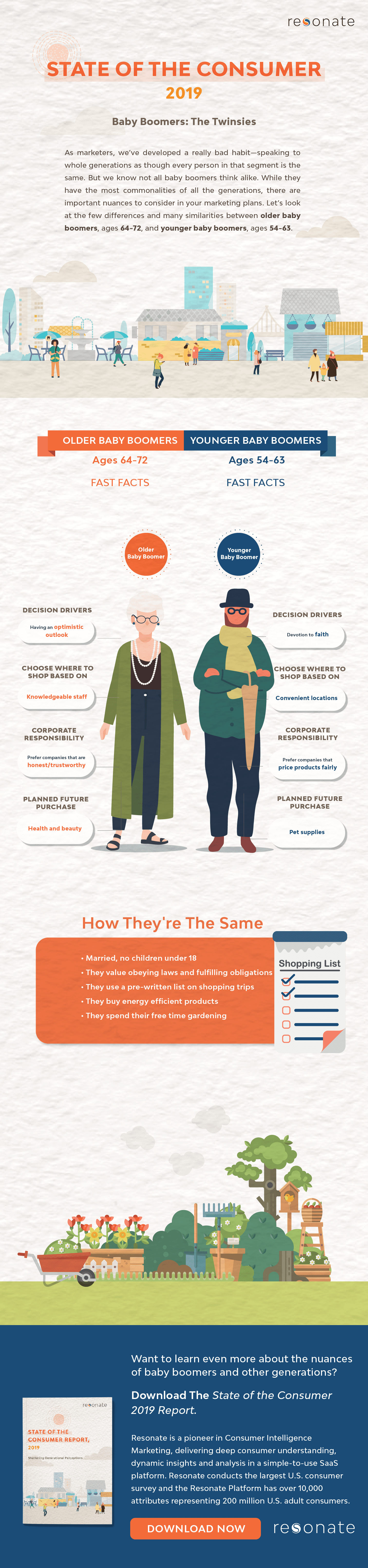 As marketers, we’ve developed a really bad habit—speaking to whole generations as though every person in that segment is the same. But we know that not all baby boomers are created equal. While baby boomers have the most commonalities of all the generations, there are important nuances to consider in your marketing plans. Let’s look at the few differences and many similarities between older baby boomers, ages 64-72, and younger baby boomers, ages 54-63.