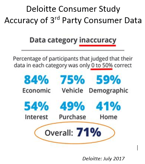 This is obvious. Poor data, poor results. Deloitte’s conclusion was that commonly sold 3rd party consumer data will remain inaccurate, which leads marketers to missed opportunities and potentially brand harmful missteps.