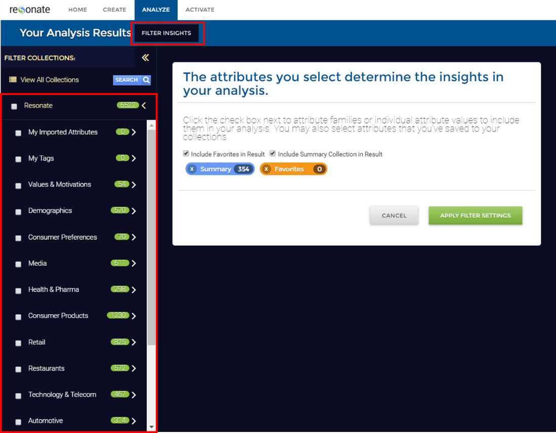 Let’s run with the example of wanting to see what your site visitors’ Social Media habits are. The Filter Insights button is where you can choose which insights – by category – you wish to view at any given time. All 7,000+ of our attributes are in the panel for easy access.