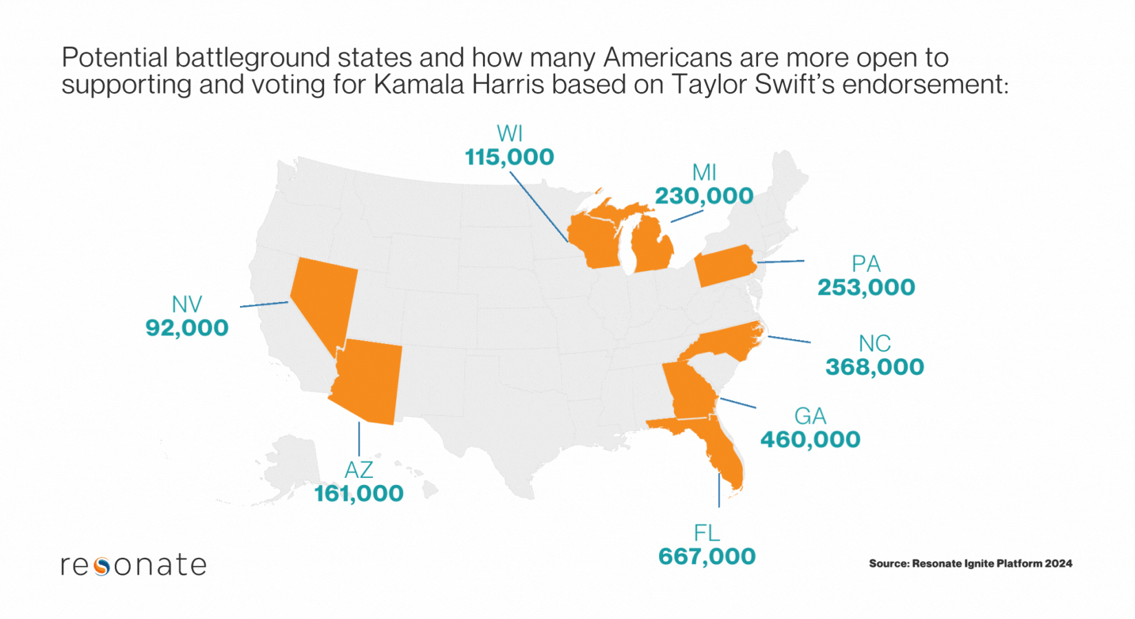 Resonate says 2.3 million Americans in battleground states are more likely to be swayed by celebrity endorsements. Those people may be rethinking their voting plans because of Swift’s Instagram post, which supported Harris and chided former President Donald Trump for a false AI-created endorsement of him.