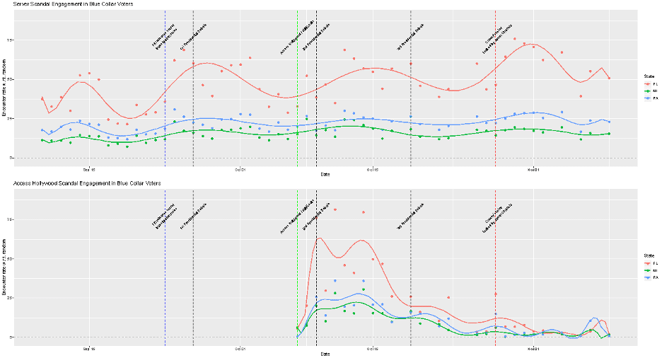 The below graph, based on data from the AI-driven Resonate Ignite intelligence platform, provides a snapshot of how blue-collar voters in key states were engaging with two important news stories leading up to the 2016 election: the Hilary Clinton email server scandal and Trump’s Access Hollywood tape. Looking at this data, we observe that the email server story was one that blue-collar voters were tracking and engaging with heavily for more than three months leading up to the election, whereas the Access Hollywood interview represented a temporary blip in consciousness. In failing to give appropriate weight and response to the former issue, while assuming the latter represented a death blow to the Trump campaign, the Clinton campaign made a critical miscalculation.