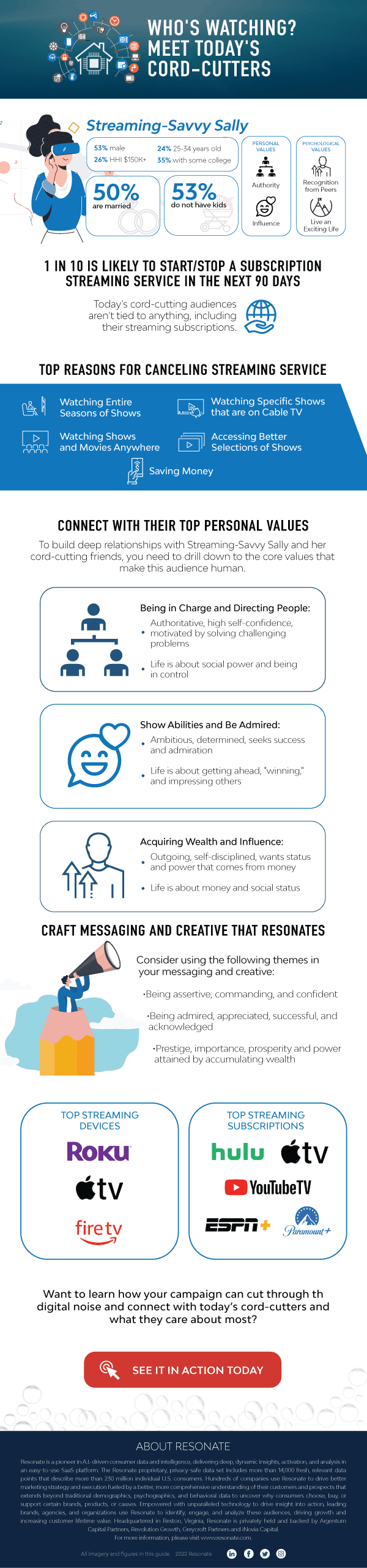 Spend for U.S. CTV advertising in 2022 is a jaw-dropping $19.1 billion. With more ad dollars flowing to streaming this year, you need to prove your network’s unique value by showcasing your advertiser’s desired target audience and sharing the deepest layers that advertisers may not even know themselves. But first, you’ll need a deeper understanding of your audience at the human level. Resonate has rich, recent, relevant CTV audience data to help you win more pitches, ad revenue, and repeat business — and we’re using these insights to show you who’s streaming.
