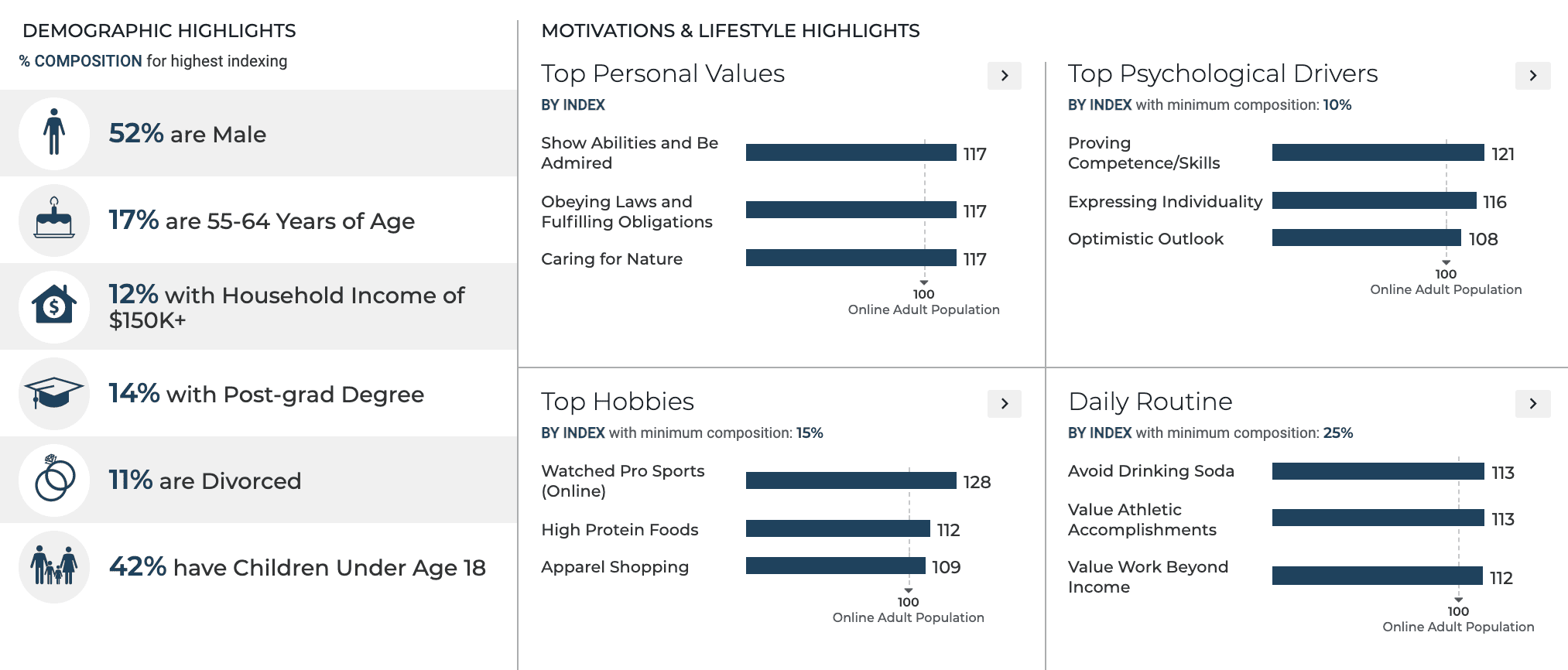 In addition to the demographics, values, media diet, and purchasing plans of the target audience, you can also dig deep into 14,000+ insights that reveal the why behind a consumer’s decisions. Present “added-value” research in your pre-sales pitches to show the advertiser that your proprietary data reaches deeper than any other data on the market. Who else can tell you whether a consumer cares more about safety, environmental impact, or that their car is an extension of themselves?