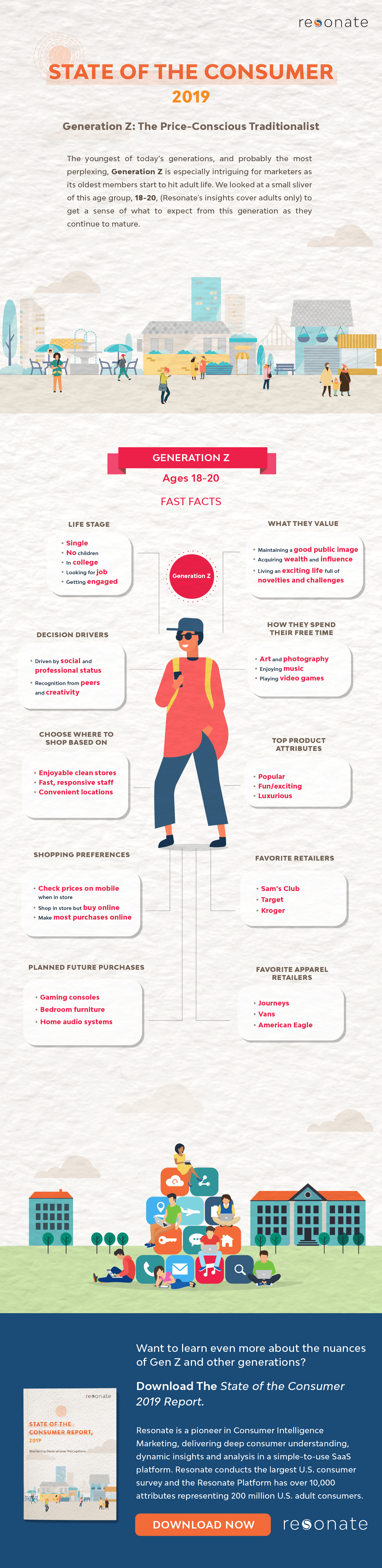 The Resonate platform revealed several interesting insights about older Gen Zers (Resonate’s person-level data begins at age 18), including the high value they place on their social and professional status and their quest to live fun and exciting lives. Check out our infographic to discover how they prefer to shop and their planned future purchases.